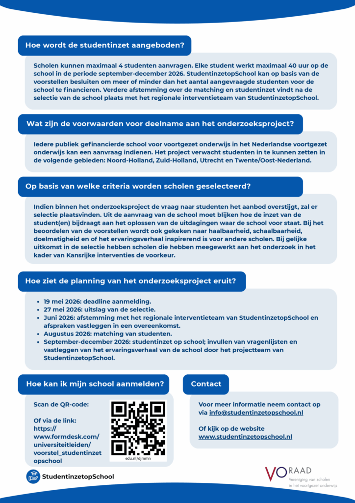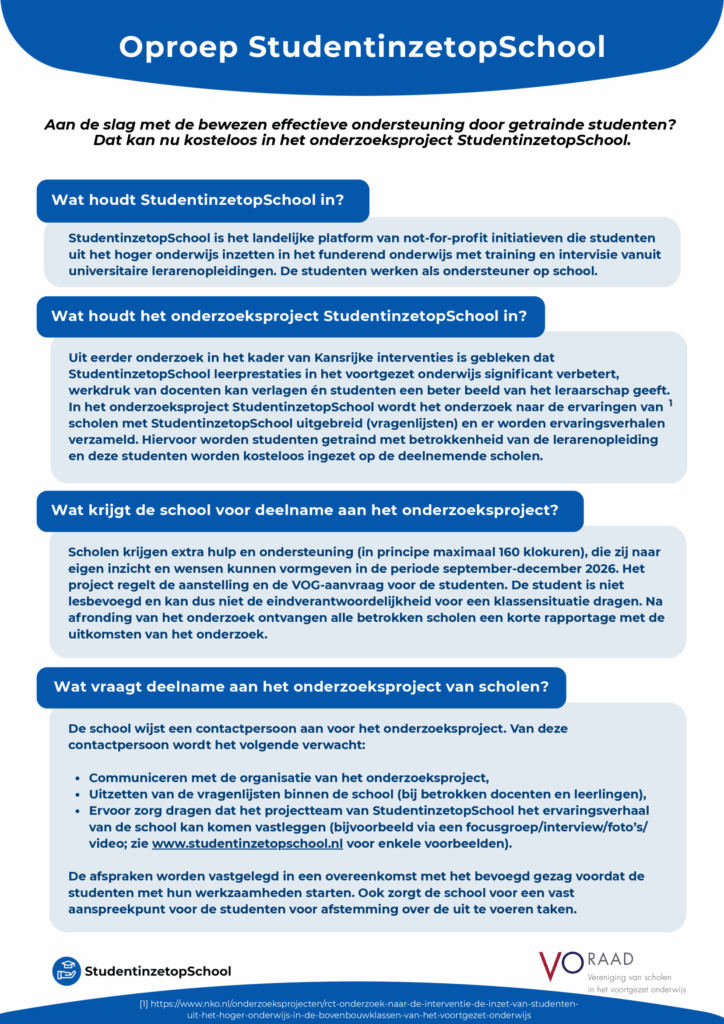 StudentinzetopSchool is een landelijk platform van initiatieven die drie dingen met elkaar gemeen hebben: