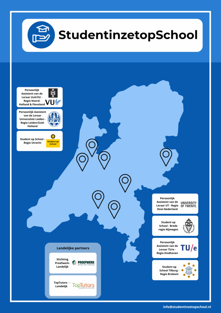 Zeven initiatieven, verspreid over Nederland, werken samen binnen StudentinzetopSchool. Hiernaast hebben we ook nauw contact met onze partners. Deze partners zijn niet verbonden aan een universitaire lerarenopleiding, maar werken wel een not-for-profit toe naar dezelfde missie .
